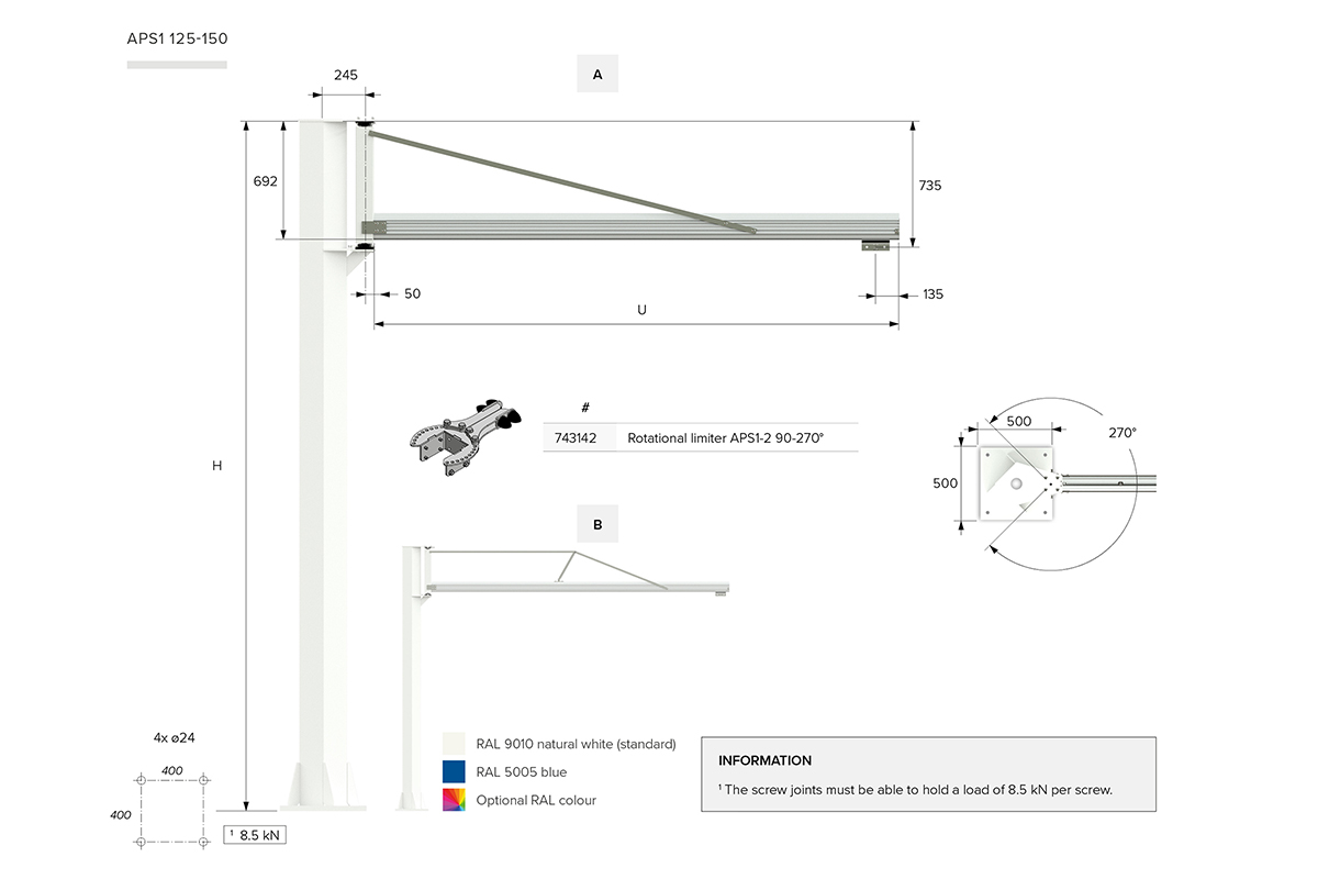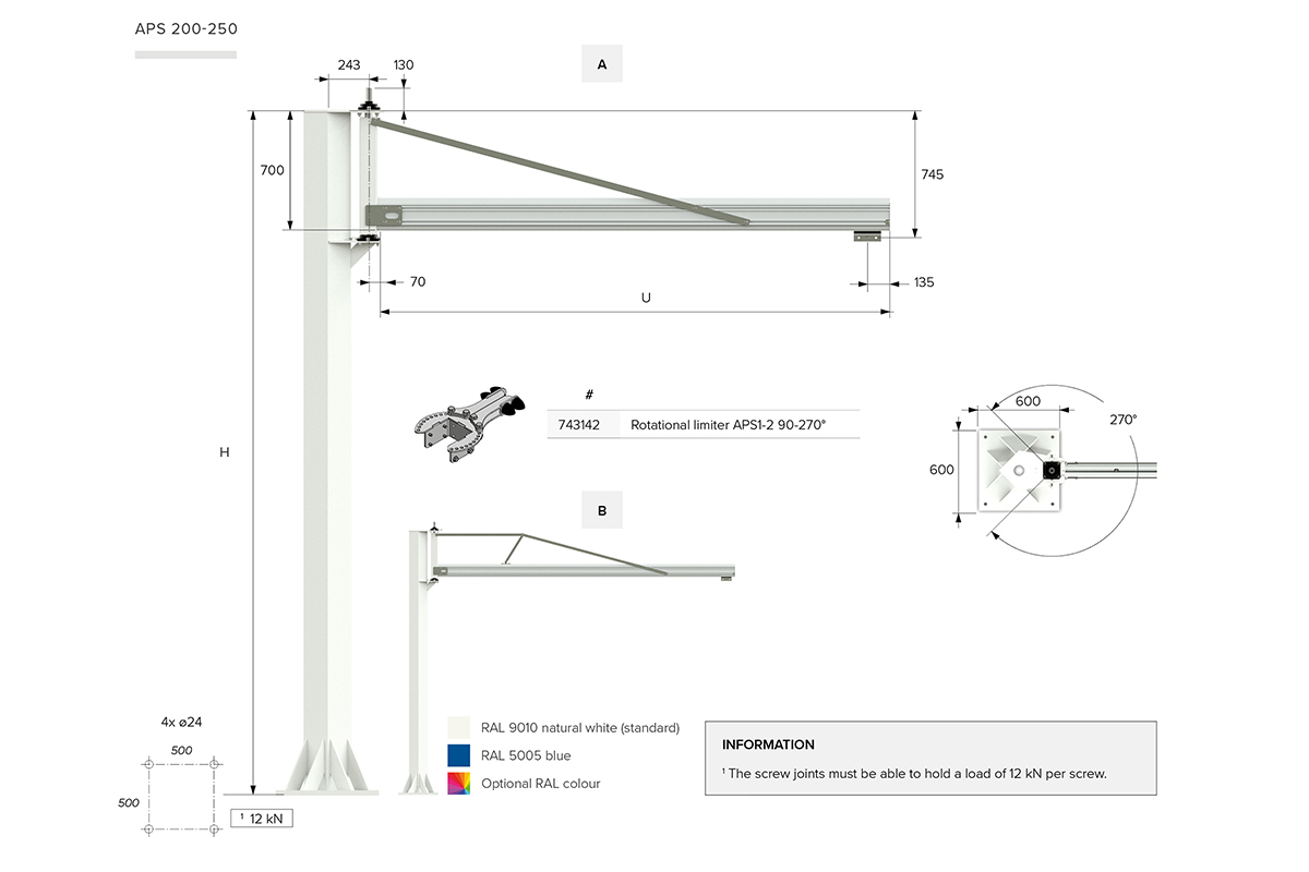 Accesorios de la gama Mechrail™ Los brazos de la grúa se pueden equipar con distintos componentes y accesorios, como carros portacables, fijaciones para accesorios, etc. Longitud y altura opcionales Las grúas montadas en pilares Mechcrane™ LPS/APS se ofrecen en diferentes alturas de pilares y longitudes de brazo de grúa opcionales en múltiplos de 0,5 m, como se especifica en catálogo. Los pilares están disponibles en un color estándar blanco neutro natural, negro o en cualquier color RAL de su elección. Además, se pueden fabricar longitudes y alturas personalizadas bajo pedido. Póngase en contacto con Movotec para obtener más información. CARACTERISTICAS DEL PRODUCTO: Brazos de grúa de bandera de movimiento extremadamente suave para una gran ergonomía Elige altura, altura y color. Amplia gama de accesorios