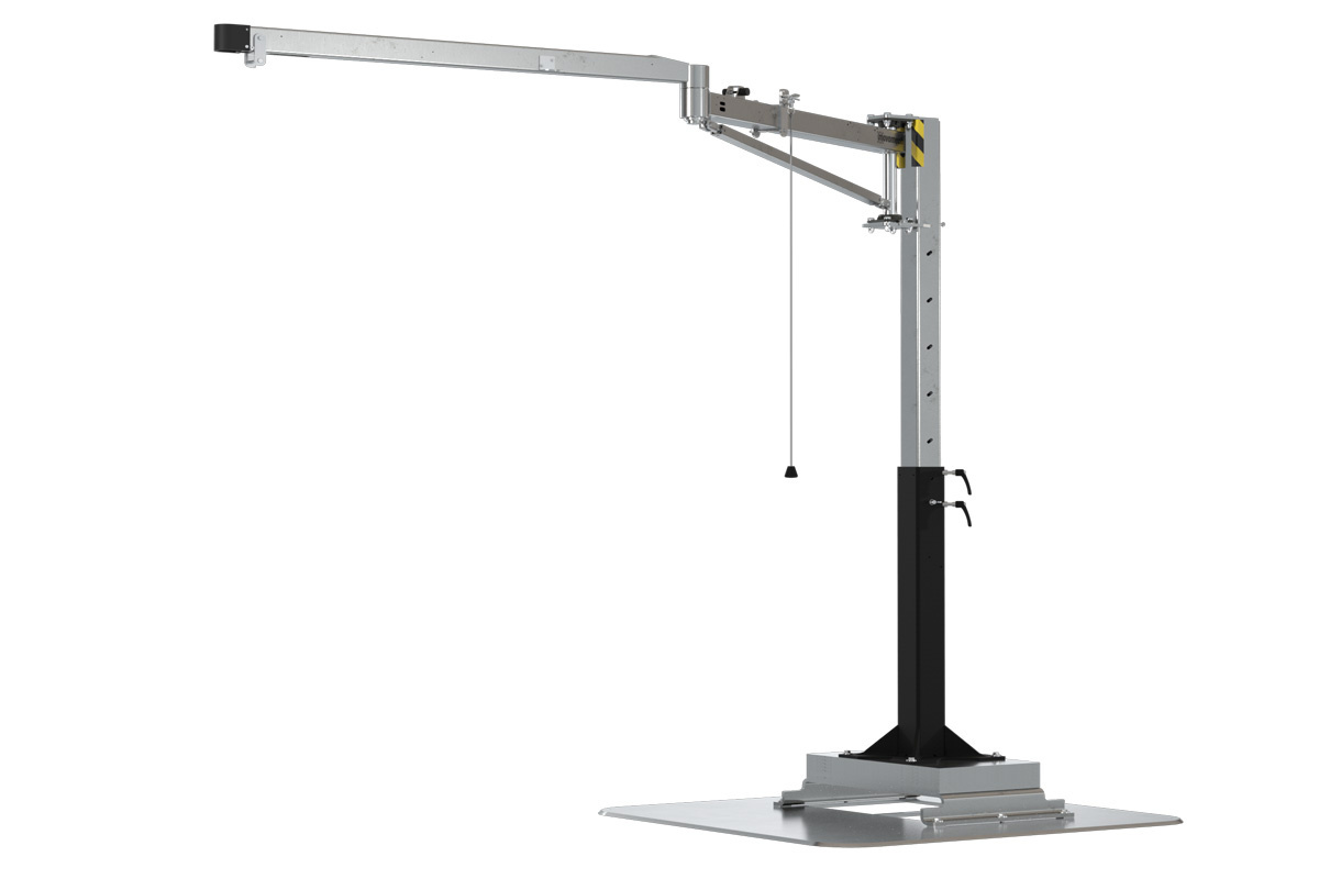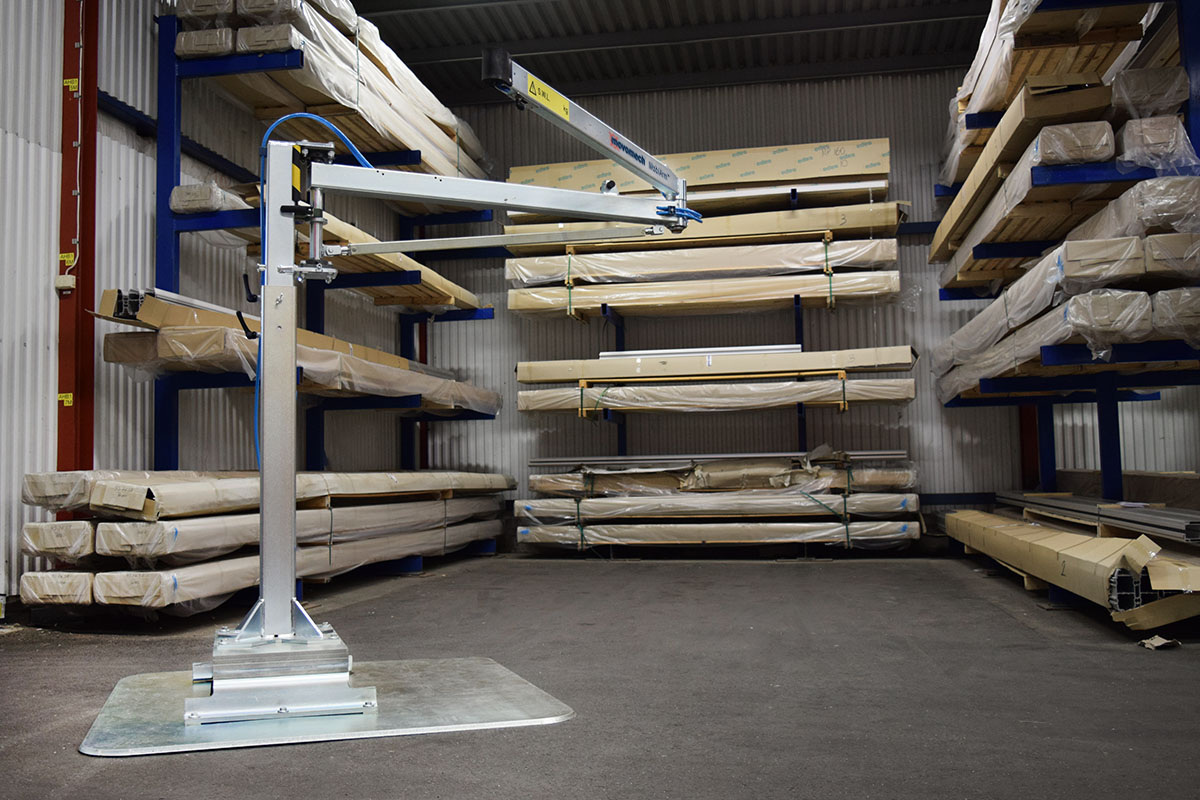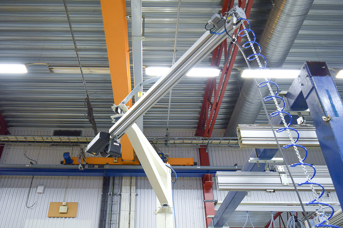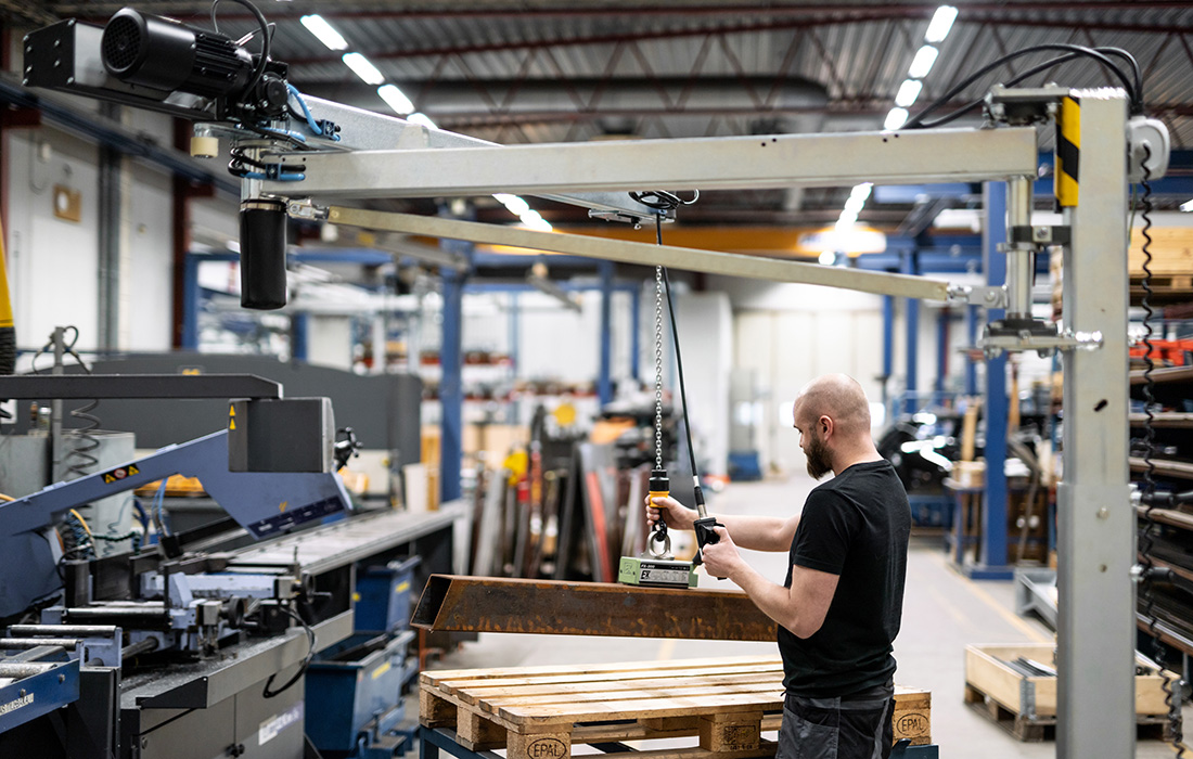 MobiArm™ es una grúa pluma articulada ergonómica que se puede adaptar a cada lugar de trabajo individual, con un alcance de hasta 4 metros y un pilar de suelo regulable en altura.