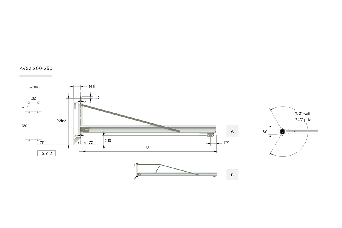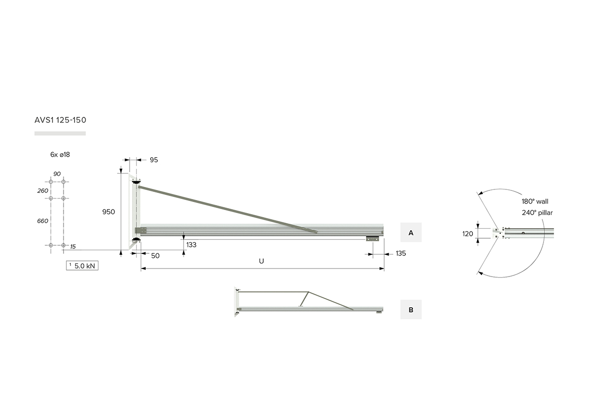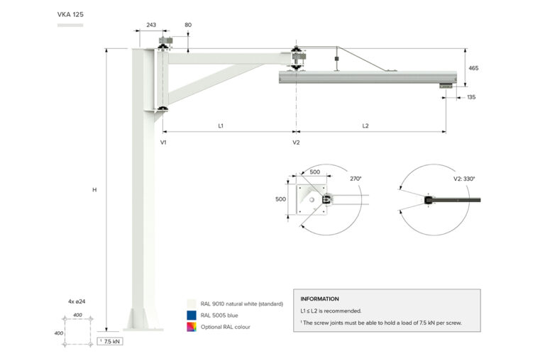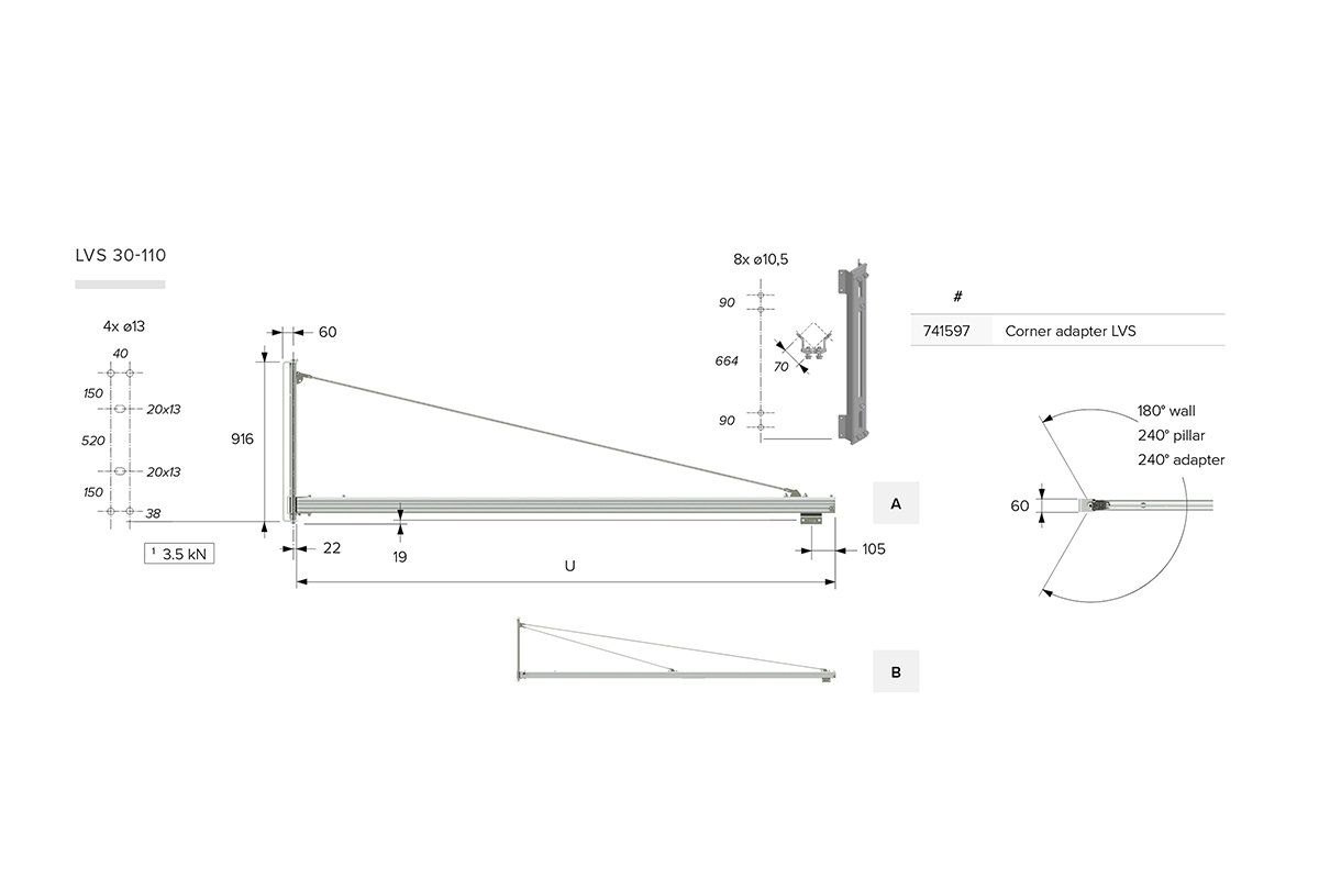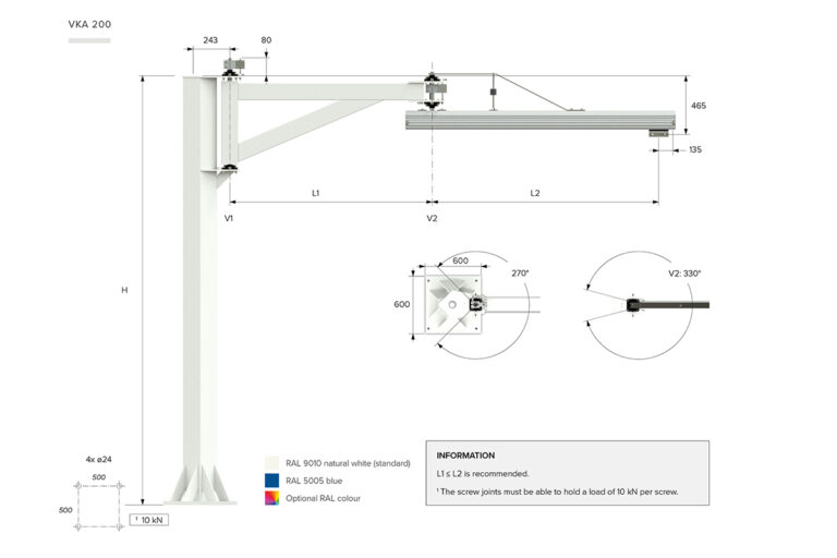Aluminio ligero y resistente. Las grúas murales de Movomech están fabricadas con perfiles de aluminio ligeros y resistentes de la gama de sistemas de grúa Mechrail™. Las ventajas de los perfiles de aluminio y de los apoyos de alta calidad en los brazos del plumín son muchas. El bajo peso y la baja fricción proporcionan un manejo suave y una ergonomía favorable para el operador. Además, los brazos de la grúa se pueden equipar con distintos componentes accesorios, como carros portacables, fijaciones para accesorios, etc. Carro de transporte suave El brazo de la grúa está equipado con un carro de aluminio robusto y de fácil desplazamiento, equipado con rodamientos de rueda de alta calidad para un manejo ergonómico del material, silencioso y suave. Longitud opcional Las grúas bandera montadas en pared Mechcrane™ LVS/AVS se ofrecen en cualquier longitud de múltiplos de 0,5 m, como se especifica a continuación. Además, se pueden fabricar longitudes personalizadas bajo petición. Póngase en contacto con Movotec para obtener más información.