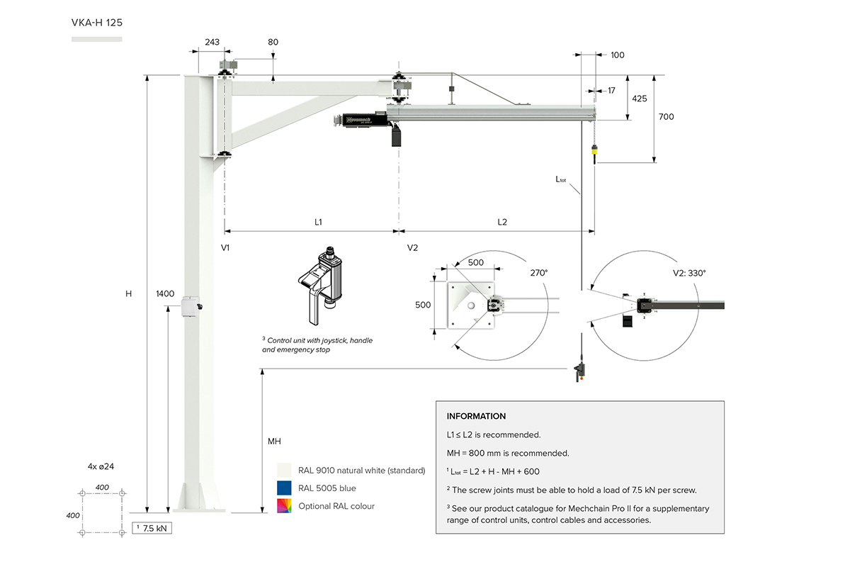 La grúa pluma articulada Mechcrane™ VKA-H combina lo mejor de dos mundos: una grúa pluma articulada ergonómica de fácil manejo con un polipasto de cadena Mechchain Pro II™ controlado por frecuencia totalmente integrado en el brazo exterior de la grúa.